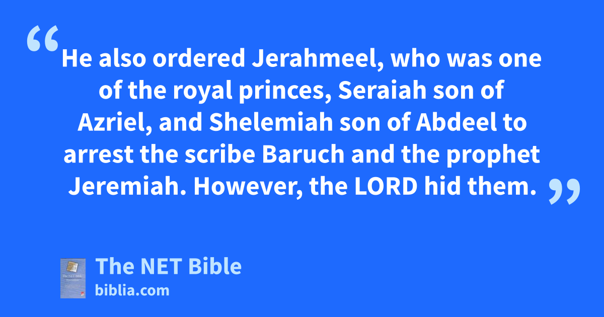 36:20 The officials put the scroll in the room of Elishama, the royal secretary, for safekeeping.35 Then they went to the court and reported everything36 to the king.37 36:21 The king sent Jehudi to get the scroll. He went and got it from the room of Elishama, the royal secretary. Then he himself38 read it to the king and all the officials who were standing around him. 36:22 Since it was the ninth month of the year, the king was sitting in his winter quarters.39 A fire was burning in the firepot in front of him.40 36:23 As soon as Jehudi had read three or four columns41 of the scroll, the king42 would cut them off with a penknife43 and throw them on the fire in the firepot. He kept doing so until the whole scroll was burned up in the fire.44 36:24 Neither he nor any of his attendants showed any alarm when they heard all that had been read. Nor did they tear their clothes to show any grief or sorrow.45 36:25 The king did not even listen to Elnathan, Delaiah, and Gemariah, who had urged him not to burn the scroll.46 36:26 He also ordered Jerahmeel, who was one of the royal princes,47 Seraiah son of Azriel, and Shelemiah son of Abdeel to arrest the scribe Baruch and the prophet Jeremiah. However, the Lord hid them.