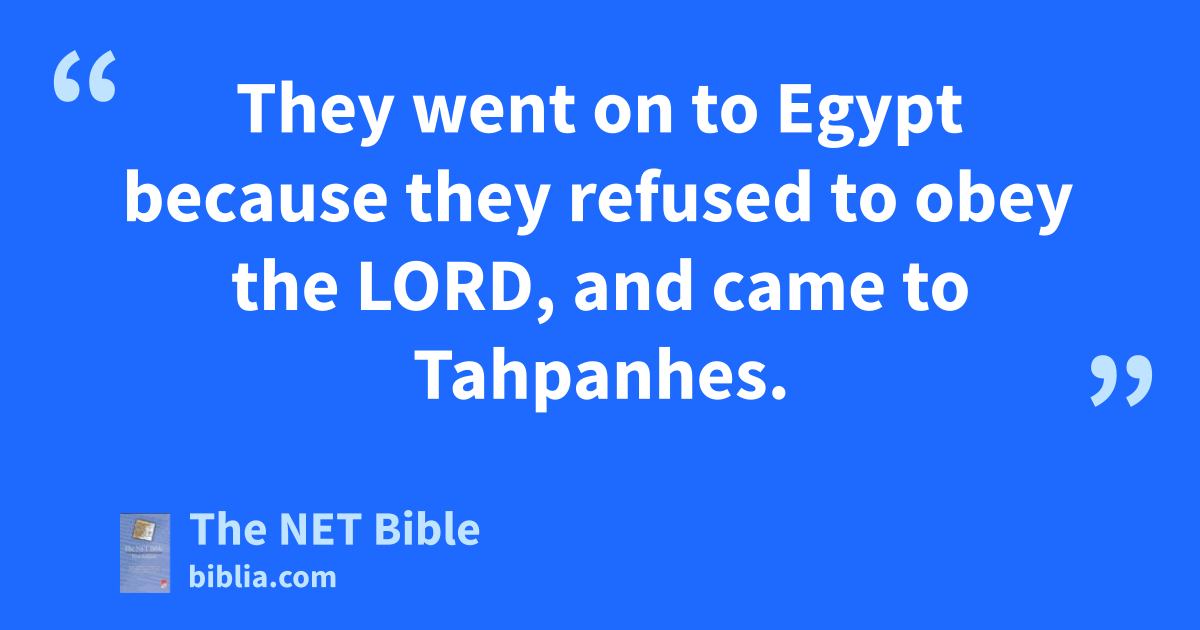 42:13 “You must not disobey the Lord your God by saying, ‘We will not stay in this land.’ 42:14 You must not say, ‘No, we will not stay. Instead we will go and live in the land of Egypt where we will not face war,16 or hear the enemy’s trumpet calls,17 or starve for lack of food.’18 42:15 If you people who remain in Judah do that, then listen to what the Lord says. The Lord God of Israel who rules over all19 says, ‘If you are so determined20 to go to Egypt that you go and settle there, 42:16 the wars you fear will catch up with you there in the land of Egypt. The starvation you are worried about will follow you there to21 Egypt. You will die there.22 42:17 All the people who are determined to go and settle in Egypt will die from war, starvation, or disease. No one will survive or escape the disaster I will bring on them.’ 42:18 For23 the Lord God of Israel who rules over all24 says, ‘If you go to Egypt, I will pour out my wrath on you just as I poured out my anger and wrath on the citizens of Jerusalem.25 You will become an object of horror and ridicule, an example of those who have been cursed and that people use in pronouncing a curse.26 You will never see this place again.’27
