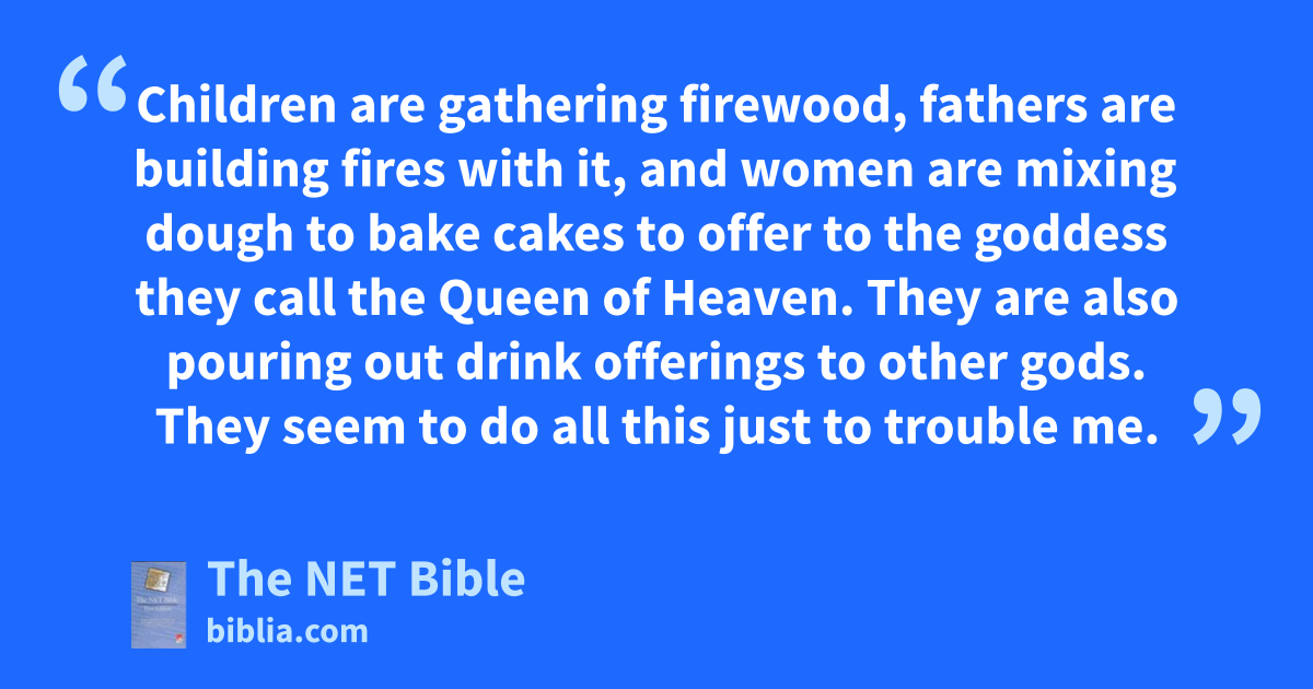 7:16 Then the Lord said,37 “As for you, Jeremiah,38 do not pray for these people! Do not cry out to me or petition me on their behalf! Do not plead with me to save them,39 because I will not listen to you. 7:17 Do you see40 what they are doing in the towns of Judah and in the streets of Jerusalem?41 7:18 Children are gathering firewood, fathers are building fires with it, and women are mixing dough to bake cakes to offer to the goddess they call the Queen of Heaven.42 They are also pouring out drink offerings to other gods. They seem to do all this just43 to trouble me. 7:19 But I am not really the one being troubled!”44 says the Lord. “Rather they are bringing trouble on themselves to their own shame!45 7:20 So,” the Lord God46 says, “my raging fury will be poured out on this land.47 It will be poured out on human beings and animals, on trees and crops.48 And it will burn like a fire which cannot be extinguished.”