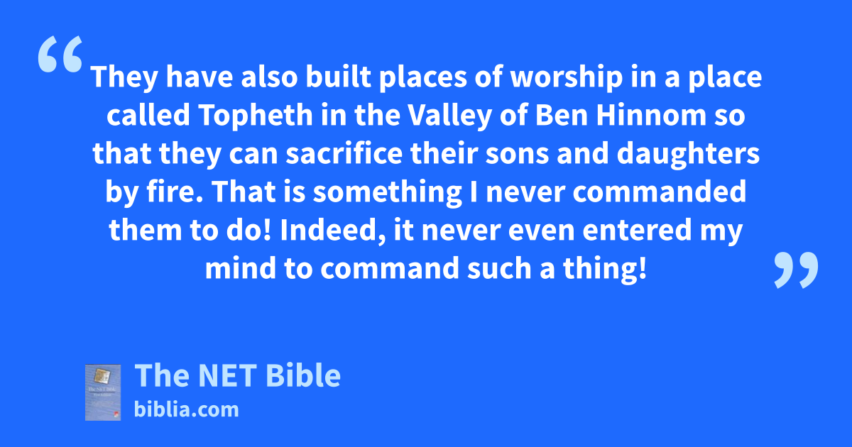7:30 The Lord says, “I have rejected them because68 the people of Judah have done what I consider evil.69 They have set up their disgusting idols in the temple70 which I have claimed for my own71 and have defiled it. 7:31 They have also built places of worship72 in a place called Topheth73 in the Valley of Ben Hinnom so that they can sacrifice their sons and daughters by fire. That is something I never commanded them to do! Indeed, it never even entered my mind to command such a thing!74 7:32 So, watch out!”75 says the Lord. “The time will soon come when people will no longer call those places Topheth or the Valley of Ben Hinnom. But they will call that valley76 the Valley of Slaughter and they will bury so many people in Topheth they will run out of room.77 7:33 Then the dead bodies of these people will be left on the ground for the birds and wild animals to eat.78 There will not be any survivors to scare them away. 7:34 I will put an end to the sounds of joy and gladness, or the glad celebration of brides and grooms throughout the towns of Judah and the streets of Jerusalem. For the whole land will become a desolate wasteland.”