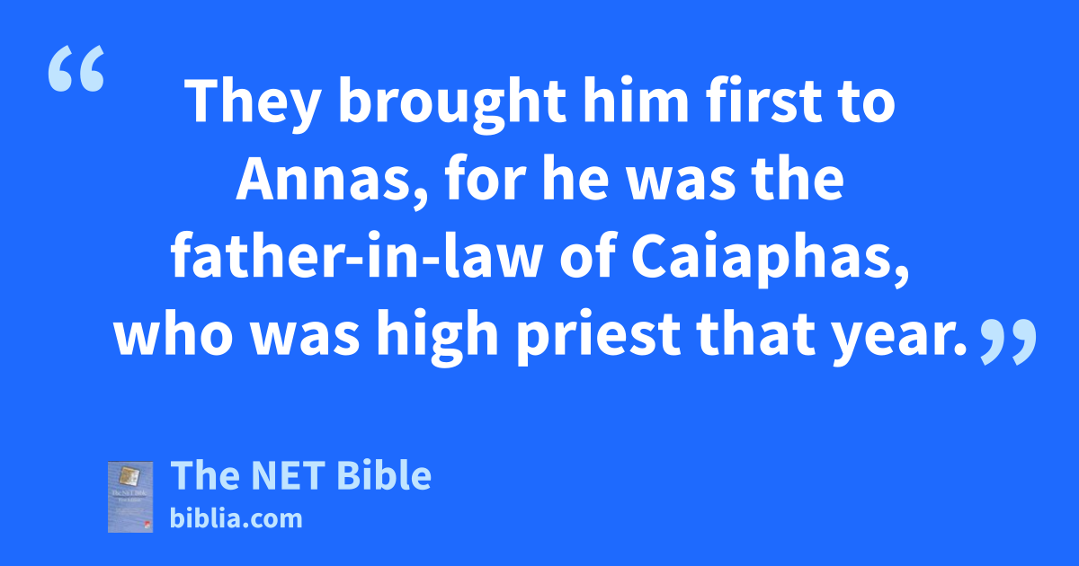 18:12 Then the squad of soldiers29 with their commanding officer30 and the officers of the Jewish leaders31 arrested32 Jesus and tied him up.33 18:13 They34 brought him first to Annas, for he was the father-in-law of Caiaphas, who was high priest that year.35 18:14 (Now it was Caiaphas who had advised36 the Jewish leaders37 that it was to their advantage that one man die for the people.)38