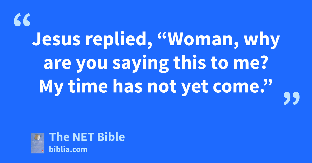 2:1 Now on the third day there was a wedding at Cana1 in Galilee.2 Jesus’ mother3 was there, 2:2 and Jesus and his disciples were also invited to the wedding.4 2:3 When the wine ran out, Jesus’ mother said to him, “They have no wine left.”5 2:4 Jesus replied,6 “Woman,7 why are you saying this to me?8 My time9 has not yet come.” 2:5 His mother told the servants, “Whatever he tells you, do it.”10