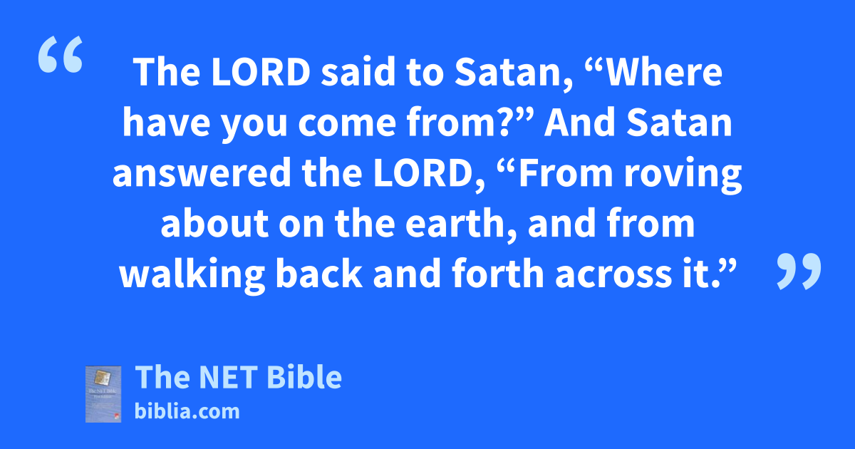 1:6 Now the day came when32 the sons of God33 came to present themselves before34 the Lord—and Satan35 also arrived among them. 1:7 The Lord said to Satan, “Where have you come from?”36 And Satan answered the Lord,37 “From roving about38 on the earth, and from walking back and forth across it.”39 1:8 So the Lord said to Satan, “Have you considered40 my servant Job? There41 is no one like him on the earth, a pure and upright man, one who fears God and turns away42 from evil.”