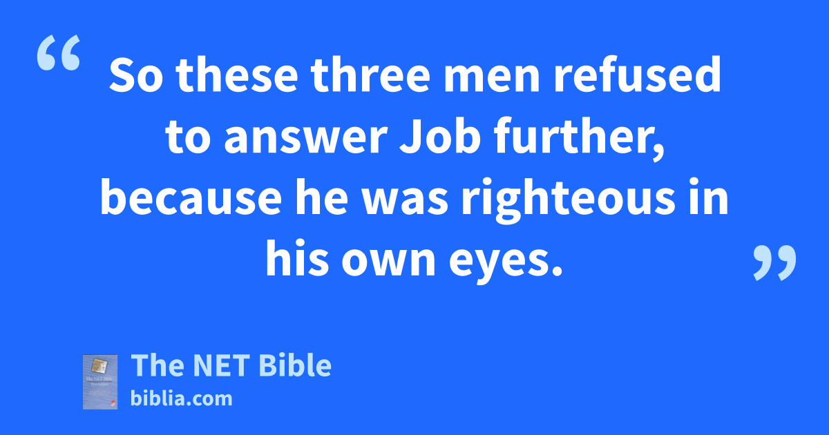32:1 So these three men refused to answer1 Job further, because he was righteous in his2 own eyes. 32:2 Then Elihu son of Barakel the Buzite, of the family of Ram, became very angry.3 He was angry4 with Job for justifying5 himself rather than God.6 32:3 With Job’s7 three friends he was also angry, because they could not find8 an answer, and so declared Job guilty.9 32:4 Now Elihu had waited before speaking10 to Job, because the others11 were older than he was. 32:5 But when Elihu saw12 that the three men had no further reply,13 he became very angry.