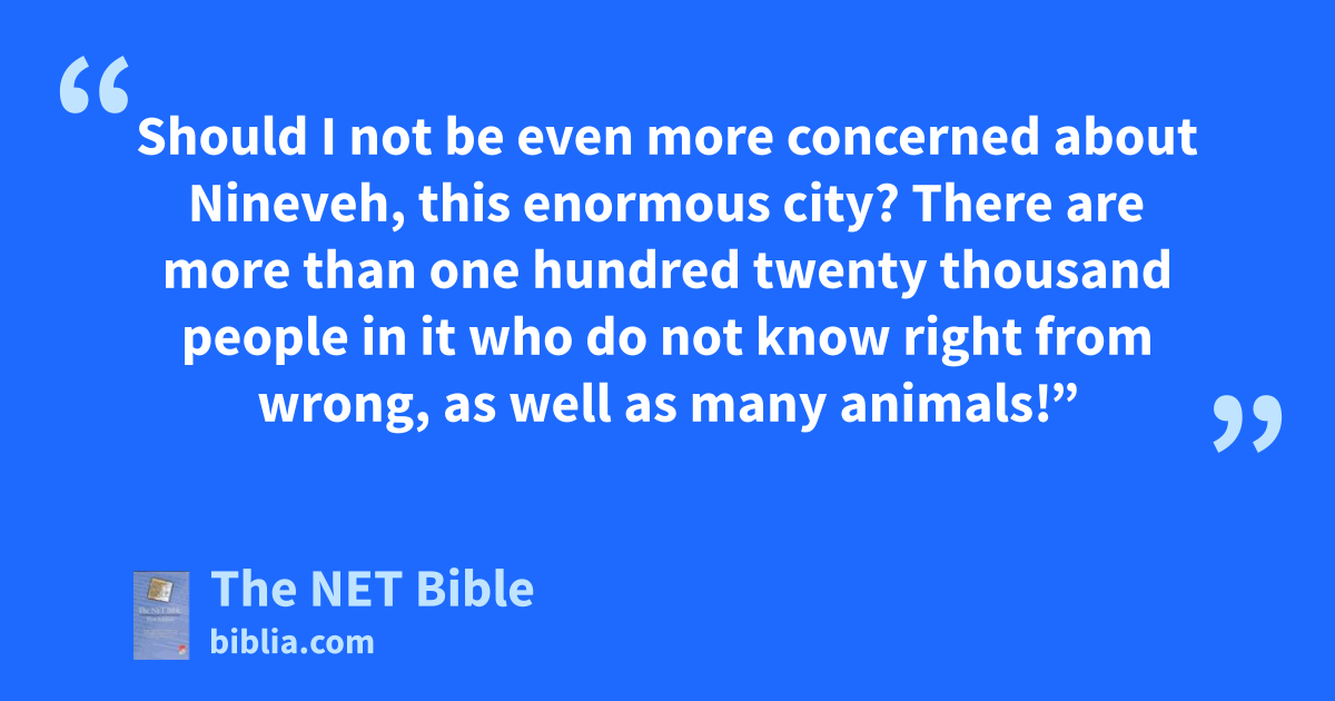 4:7 So God sent24 a worm at dawn the next day, and it attacked the little plant so that it dried up. 4:8 When the sun began to shine, God sent25 a hot26 east wind. So the sun beat down27 on Jonah’s head, and he grew faint. So he despaired of life,28 and said, “I would rather die than live!”29 4:9 God said to Jonah, “Are you really so very angry30 about the little plant?” And he said, “I am as angry31 as I could possibly be!”32 4:10 The Lord said, “You were upset33 about this little34 plant, something for which you have not worked nor did you do anything to make it grow. It grew up overnight and died the next day.35 4:11 Should I36 not be even more37 concerned38 about Nineveh, this enormous city?39 There are more than one hundred twenty thousand people in it who do not know right from wrong,40 as well as many animals!”41
