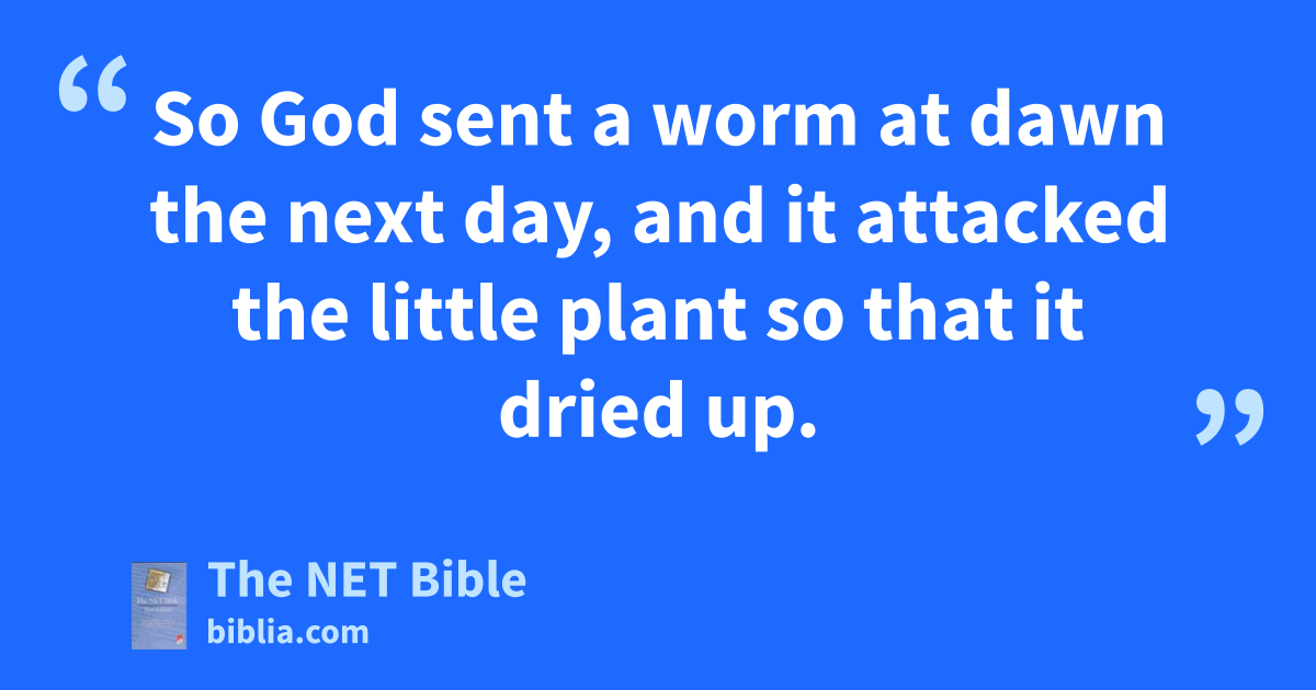 4:7 So God sent24 a worm at dawn the next day, and it attacked the little plant so that it dried up. 4:8 When the sun began to shine, God sent25 a hot26 east wind. So the sun beat down27 on Jonah’s head, and he grew faint. So he despaired of life,28 and said, “I would rather die than live!”29 4:9 God said to Jonah, “Are you really so very angry30 about the little plant?” And he said, “I am as angry31 as I could possibly be!”32 4:10 The Lord said, “You were upset33 about this little34 plant, something for which you have not worked nor did you do anything to make it grow. It grew up overnight and died the next day.35 4:11 Should I36 not be even more37 concerned38 about Nineveh, this enormous city?39 There are more than one hundred twenty thousand people in it who do not know right from wrong,40 as well as many animals!”41