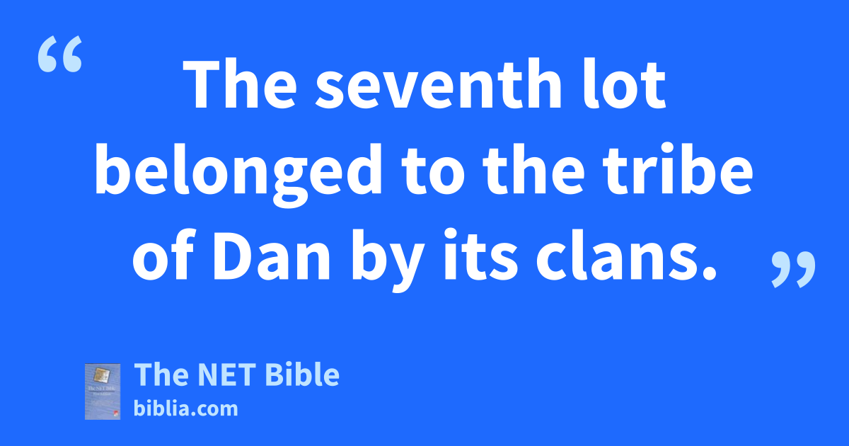 19:40 The seventh lot belonged to the tribe of Dan31 by its clans. 19:41 Their assigned land included Zorah, Eshtaol, Ir Shemesh, 19:42 Shaalabbin, Aijalon, Ithlah, 19:43 Elon, Timnah, Ekron, 19:44 Eltekeh, Gibbethon, Baalath, 19:45 Jehud, Bene Berak, Gath Rimmon, 19:46 the waters of Jarkon, and Rakkon, including the territory in front of Joppa. 19:47 (The Danites failed to conquer their territory,32 so they went up and fought with Leshem and captured it. They put the sword to it, took possession of it, and lived in it. They renamed it33 Dan after their ancestor.34) 19:48 This was the land assigned to the tribe of Dan35 by its clans, including these cities and their towns.