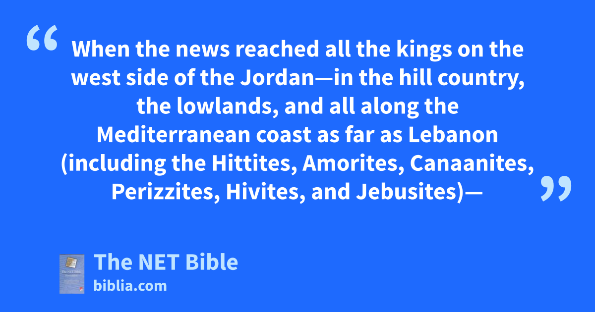 9:1 When the news reached all the kings on the west side of the Jordan1—in the hill country, the lowlands,2 and all along the Mediterranean coast3 as far as4 Lebanon (including the Hittites, Amorites, Canaanites, Perizzites, Hivites, and Jebusites)—9:2 they formed an alliance to fight against Joshua and Israel.5