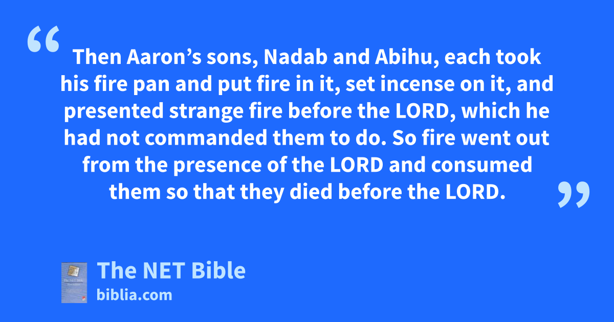 10:1 Then1 Aaron’s sons, Nadab and Abihu, each took his fire pan and put fire in it, set incense on it, and presented strange fire2 before the Lord, which he had not commanded them to do. 10:2 So fire went out from the presence of the Lord3 and consumed them so that they died before the Lord. 10:3 Moses then said to Aaron, “This is what the Lord spoke: ‘Among the ones close to me I will show myself holy,4 and in the presence of all the people I will be honored.’ ”5 So Aaron kept silent. 10:4 Moses then called to Mishael and Elzaphan, the sons of Uzziel, Aaron’s uncle, and said to them, “Come near, carry your brothers away from the front of the sanctuary to a place outside the camp.” 10:5 So they came near and carried them away in their tunics to a place outside the camp just as Moses had spoken. 10:6 Then Moses said to Aaron and to Eleazar and Ithamar his other two sons, “Do not6 dishevel the hair of your heads7 and do not tear your garments, so that you do not die and so that wrath does not come on the whole congregation. Your brothers, all the house of Israel, are to mourn the burning which the Lord has caused,8 10:7 but you must not go out from the entrance of the Meeting Tent lest you die, for the Lord’s anointing oil is on you.” So they acted according to the word of Moses.