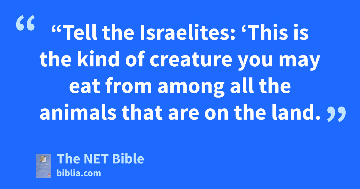 11:1 The Lord spoke to Moses and Aaron, saying to them, 11:2 “Tell the Israelites: ‘This is the kind of creature you may eat from among all the animals1 that are on the land. 11:3 You may eat any among the animals that has a divided hoof (the hooves are completely split in two2) and that also chews the cud.3 11:4 However, you must not eat these4 from among those that chew the cud and have divided hooves: The camel is unclean to you5 because it chews the cud6 even though its hoof is not divided.7 11:5 The rock badger8 is unclean to you because it chews the cud even though its hoof is not divided. 11:6 The hare is unclean to you because it chews the cud even though its hoof is not divided. 11:7 The pig is unclean to you because its hoof is divided (the hoof is completely split in two9), even though it does not chew the cud.10 11:8 You must not eat from their meat and you must not touch their carcasses;11 they are unclean to you.