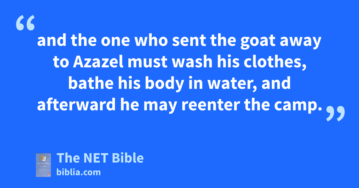 16:25 “Then he is to offer up the fat of the sin offering43 in smoke on the altar, 16:26 and the one who sent the goat away to Azazel44 must wash his clothes, bathe his body in water, and afterward he may reenter the camp. 16:27 The bull of the sin offering and the goat of the sin offering, whose blood was brought to make atonement in the holy place, must be brought outside the camp45 and their hide, their flesh, and their dung must be burned up,46 16:28 and the one who burns them must wash his clothes and bathe his body in water, and afterward he may reenter the camp.