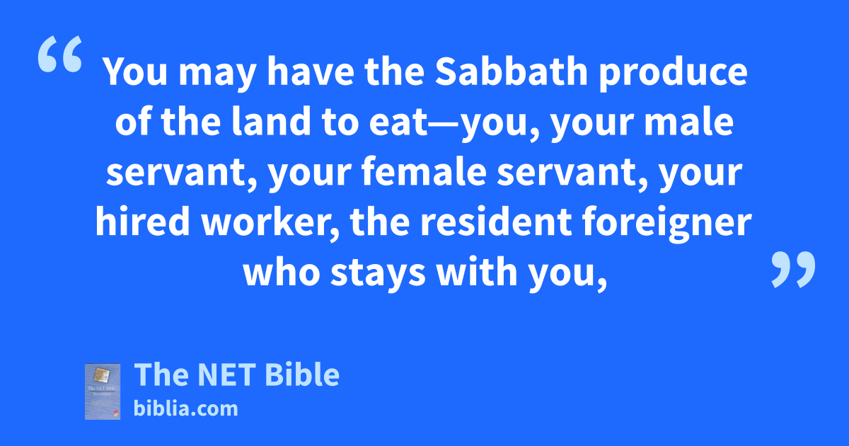 25:1 The Lord spoke to Moses at Mount Sinai: 25:2 “Speak to the Israelites and tell them, ‘When you enter the land that I am giving you, the land must observe a Sabbath1 to the Lord. 25:3 Six years you may sow your field, and six years you may prune your vineyard and gather the produce,2 25:4 but in the seventh year the land must have a Sabbath of complete rest3—a Sabbath to the Lord. You must not sow your field or4 prune your vineyard. 25:5 You must not gather in the aftergrowth of your harvest and you must not pick the grapes of your unpruned5 vines; the land must have a year of complete rest. 25:6 You may have the Sabbath produce6 of the land to eat—you, your male servant, your female servant, your hired worker, the resident foreigner who stays with you,7 25:7 your cattle, and the wild animals that are in your land—all its produce will be for you8 to eat.