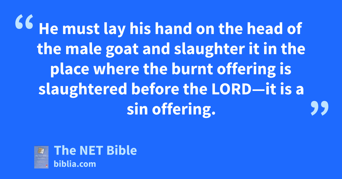 4:22 “ ‘Whenever44 a leader, by straying unintentionally,45 sins and violates one of the commandments of the Lord his God which must not be violated,46 and he pleads guilty, 4:23 or his sin that he committed47 is made known to him,48 he must bring a flawless male goat as his offering.49 4:24 He must lay his hand on the head of the male goat and slaughter50 it in the place where the burnt offering is slaughtered before the Lord—it is a sin offering. 4:25 Then the priest must take some of the blood of the sin offering with his finger and put it on the horns of the altar of burnt offering, and he must pour out the rest of its blood at the base of the altar of burnt offering. 4:26 Then the priest51 must offer all of its fat up in smoke on the altar like the fat of the peace offering sacrifice. So the priest will make atonement52 on his behalf for53 his sin and he will be forgiven.54