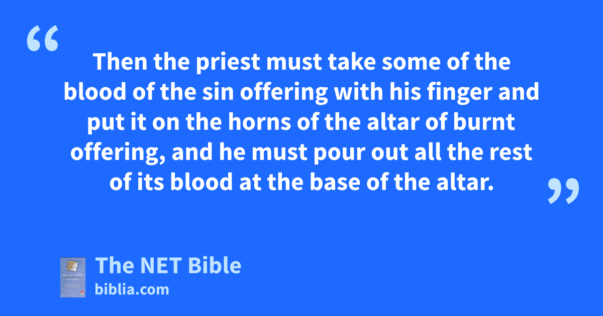 4:32 “ ‘But if he brings a sheep as his offering, for a sin offering, he must bring a flawless female. 4:33 He must lay his hand on the head of the sin offering and slaughter it for a sin offering in the place where the burnt offering is slaughtered. 4:34 Then the priest must take some of the blood of the sin offering with his finger and put it on the horns of the altar of burnt offering, and he must pour out all the rest of its blood at the base of the altar. 4:35 Then the one who brought the offering65 must remove all its fat (just as the fat of the sheep is removed from the peace offering sacrifice) and the priest must offer them up in smoke on the altar on top of the other gifts of the Lord. So the priest will make atonement66 on his behalf for his sin which he has committed and he will be forgiven.67