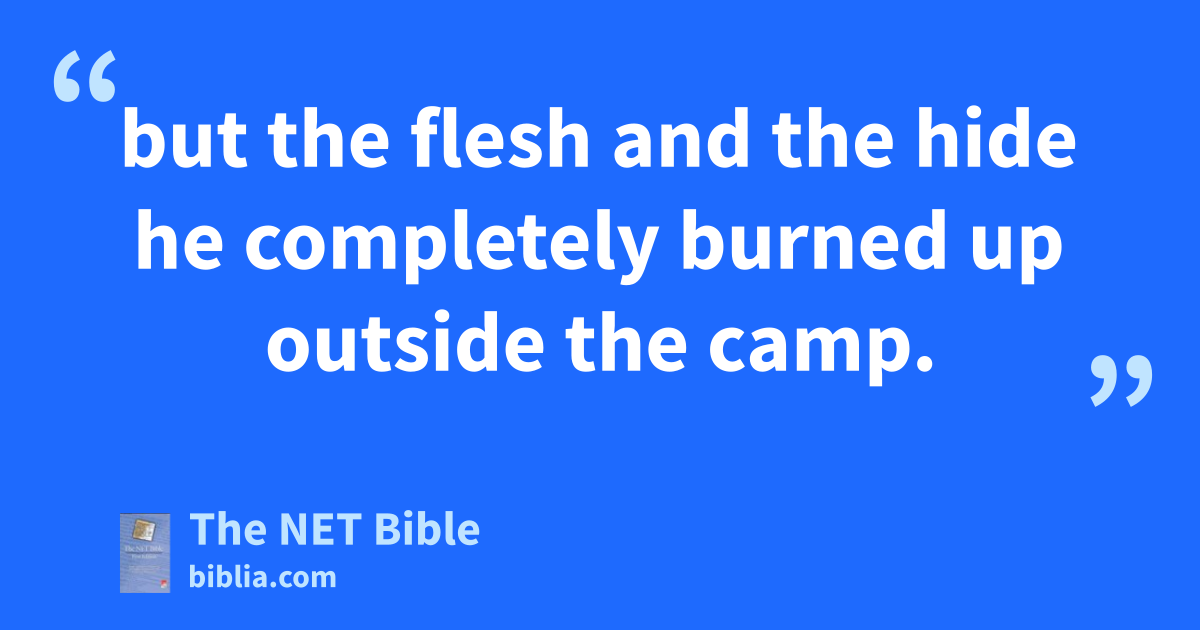 9:8 So Aaron approached the altar and slaughtered the sin offering calf which was for himself. 9:9 Then Aaron’s sons presented the blood to him and he dipped his finger in the blood and put it on the horns of the altar, and the rest of the blood he poured out at the base of the altar. 9:10 The fat and the kidneys and the protruding lobe of10 the liver from the sin offering he offered up in smoke on the altar just as the Lord had commanded Moses, 9:11 but the flesh and the hide he completely burned up11 outside the camp.12