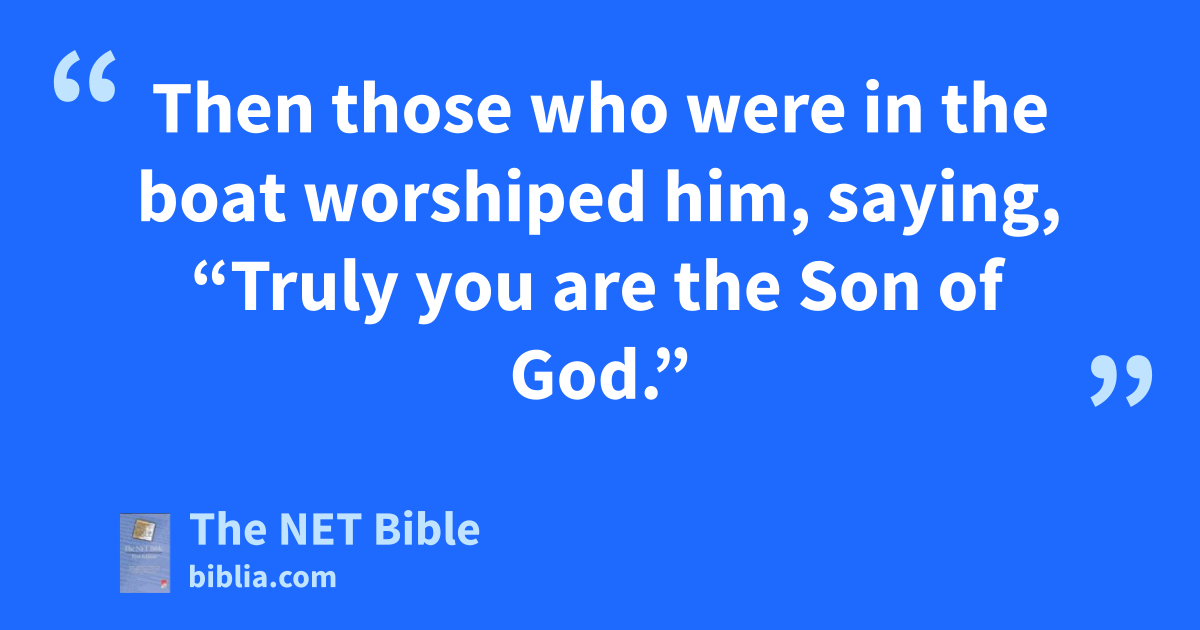 14:22 Immediately Jesus22 made the disciples get into the boat and go ahead of him to the other side, while he dispersed the crowds. 14:23 And after he sent the crowds away, he went up the mountain by himself to pray. When evening came, he was there alone. 14:24 Meanwhile the boat, already far from land,23 was taking a beating from the waves because the wind was against it. 14:25 As the night was ending,24 Jesus came to them walking on the sea.25 14:26 When26 the disciples saw him walking on the water27 they were terrified and said, “It’s a ghost!” and cried out with fear. 14:27 But immediately Jesus28 spoke to them:29 “Have courage! It is I. Do not be afraid.” 14:28 Peter30 said to him,31 “Lord, if it is you, order me to come to you on the water.” 14:29 So he said, “Come.” Peter got out of the boat, walked on the water, and came toward Jesus. 14:30 But when he saw the strong wind he became afraid. And starting to sink, he cried out,32 “Lord, save me!” 14:31 Immediately Jesus reached out his hand and caught him, saying to him, “You of little faith, why did you doubt?” 14:32 When they went up into the boat, the wind ceased. 14:33 Then those who were in the boat worshiped him, saying, “Truly you are the Son of God.”
