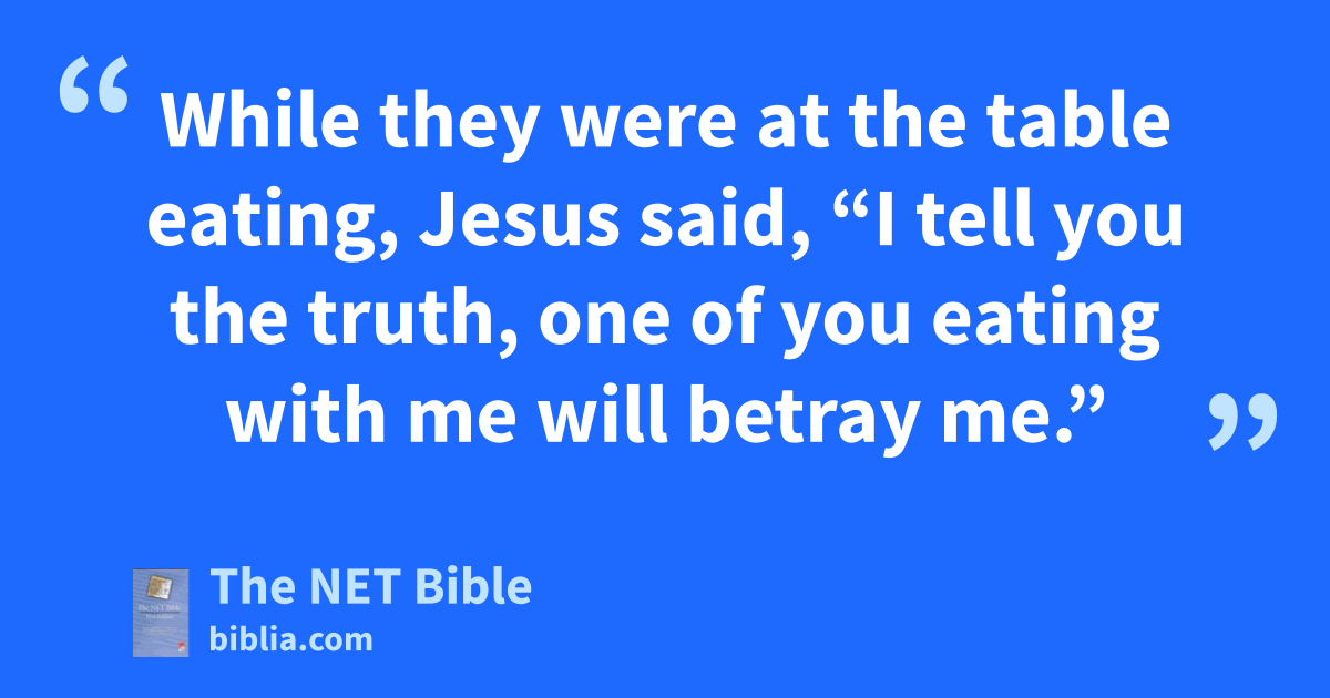 14:17 Then,32 when it was evening, he came to the house33 with the twelve. 14:18 While they were at the table34 eating, Jesus said, “I tell you the truth,35 one of you eating with me will betray me.”36 14:19 They were distressed, and one by one said to him, “Surely not I?” 14:20 He said to them, “It is one of the twelve, one who dips his hand37 with me into the bowl.38 14:21 For the Son of Man will go as it is written about him, but woe to that man by whom the Son of Man is betrayed! It would be better for him if he had never been born.”