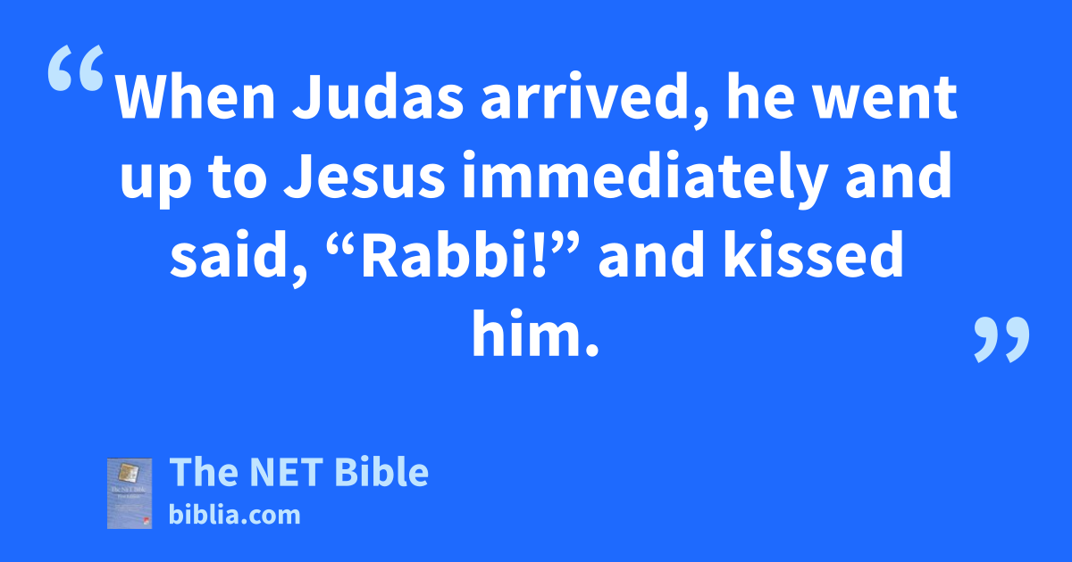 14:43 Right away, while Jesus59 was still speaking, Judas, one of the twelve, arrived.60 With him came a crowd armed with swords and clubs, sent by the chief priests and experts in the law61 and elders. 14:44 (Now the betrayer62 had given them a sign, saying, “The one I kiss is the man. Arrest him and lead him away under guard.”)63 14:45 When Judas64 arrived, he went up to Jesus65 immediately and said, “Rabbi!” and kissed66 him. 14:46 Then they took hold of him67 and arrested him. 14:47 One of the bystanders drew his sword and struck the high priest’s slave,68 cutting off his ear. 14:48 Jesus said to them, “Have you come with swords and clubs to arrest me like you would an outlaw?69 14:49 Day after day I was with you, teaching in the temple courts, yet70 you did not arrest me. But this has happened so that71 the scriptures would be fulfilled.” 14:50 Then72 all the disciples73 left him and fled. 14:51 A young man was following him, wearing only a linen cloth. They tried to arrest him, 14:52 but he ran off naked,74 leaving his linen cloth behind.