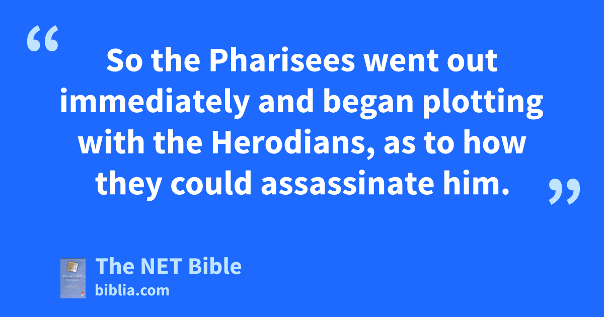 3:1 Then1 Jesus2 entered the synagogue3 again, and a man was there who had a withered4 hand. 3:2 They watched5 Jesus6 closely to see if he would heal him on the Sabbath,7 so that they could accuse him. 3:3 So he said to the man who had the withered hand, “Stand up among all these people.”8 3:4 Then9 he said to them, “Is it lawful to do good on the Sabbath, or evil, to save a life or destroy it?” But they were silent. 3:5 After looking around10 at them in anger, grieved by the hardness of their hearts,11 he said to the man, “Stretch out your hand.” He stretched it out, and his hand was restored.12 3:6 So13 the Pharisees14 went out immediately and began plotting with the Herodians,15 as to how they could assassinate16 him.