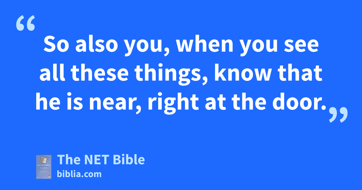 24:32 “Learn48 this parable from the fig tree: Whenever its branch becomes tender and puts out its leaves, you know that summer is near. 24:33 So also you, when you see all these things, know49 that he is near, right at the door. 24:34 I tell you the truth,50 this generation51 will not pass away until all these things take place. 24:35 Heaven and earth will pass away, but my words will never pass away.52