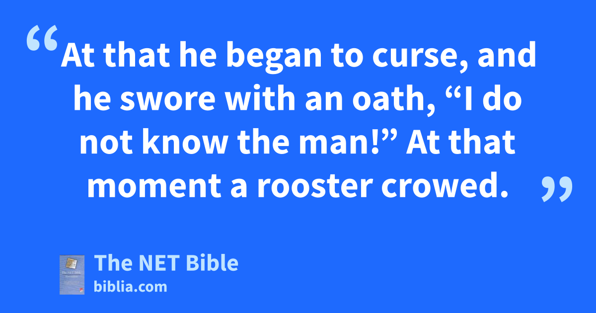 26:69 Now Peter was sitting outside in the courtyard. A90 slave girl91 came to him and said, “You also were with Jesus the Galilean.” 26:70 But he denied it in front of them all:92 “I don’t know what you’re talking about!” 26:71 When93 he went out to the gateway, another slave girl94 saw him and said to the people there, “This man was with Jesus the Nazarene.” 26:72 He denied it again with an oath, “I do not know the man!” 26:73 After95 a little while, those standing there came up to Peter and said, “You really are one of them too—even your accent96 gives you away!” 26:74 At that he began to curse, and he swore with an oath, “I do not know the man!” At that moment a rooster crowed.97 26:75 Then Peter remembered what Jesus had said: “Before the rooster crows, you will deny me three times.” And he went outside and wept bitterly.98