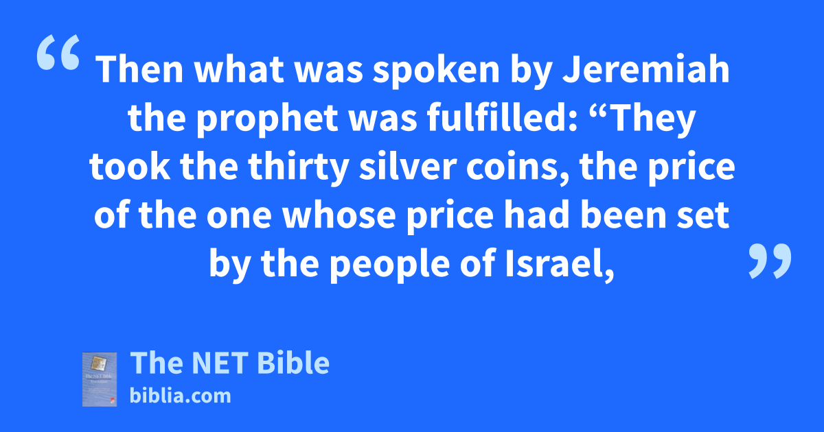 27:3 Now when5 Judas, who had betrayed him, saw that Jesus6 had been condemned, he regretted what he had done and returned the thirty silver coins to the chief priests and the elders, 27:4 saying, “I have sinned by betraying innocent blood!” But they said, “What is that to us? You take care of it yourself!” 27:5 So7 Judas threw the silver coins into the temple and left. Then he went out and hanged himself. 27:6 The8 chief priests took the silver and said, “It is not lawful to put this into the temple treasury, since it is blood money.” 27:7 After9 consulting together they bought the Potter’s Field with it, as a burial place for foreigners. 27:8 For this reason that field has been called the “Field of Blood” to this day. 27:9 Then what was spoken by Jeremiah10 the prophet was fulfilled: “They took the thirty silver coins, the price of the one whose price had been set by the people of Israel,11 27:10 and they gave them for the potter’s field, as the Lord commanded me.”12
