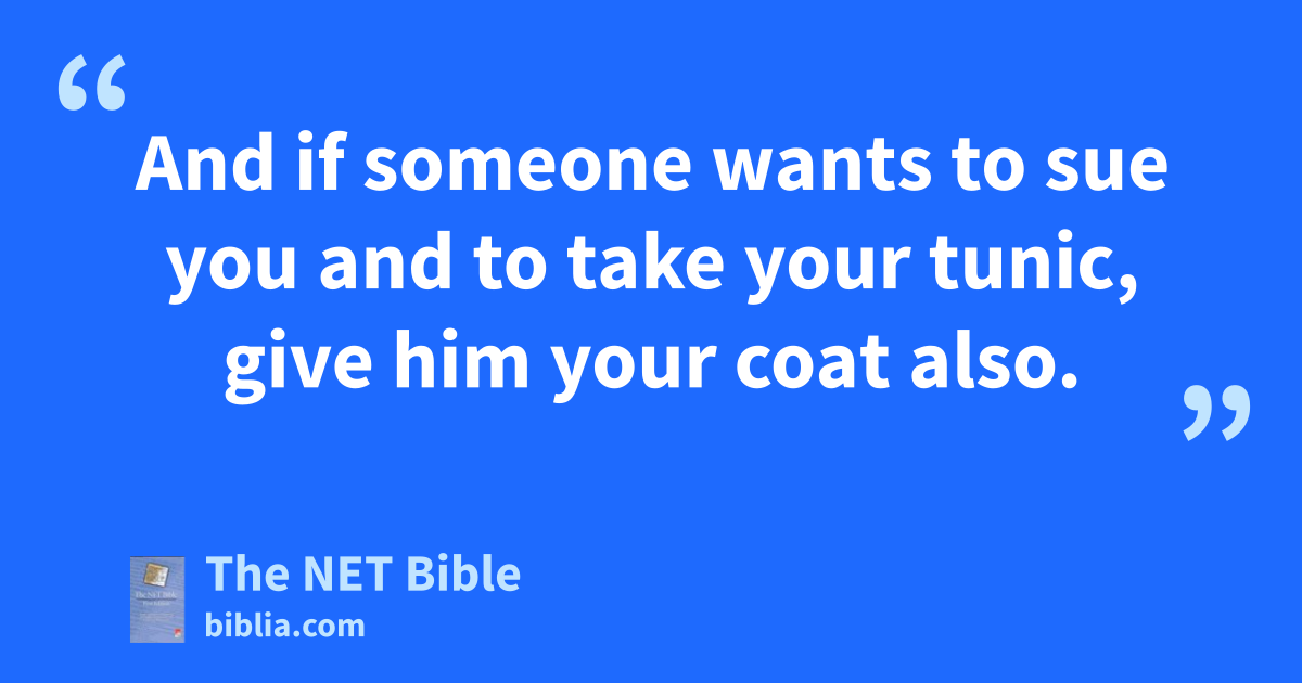 5:38 “You have heard that it was said, ‘An eye for an eye and a tooth for a tooth.’45 5:39 But I say to you, do not resist the evildoer.46 But whoever strikes you on the47 right cheek, turn the other to him as well. 5:40 And if someone wants to sue you and to take your tunic,48 give him your coat also. 5:41 And if anyone forces you to go one mile,49 go with him two. 5:42 Give to the one who asks you,50 and do not reject51 the one who wants to borrow from you.