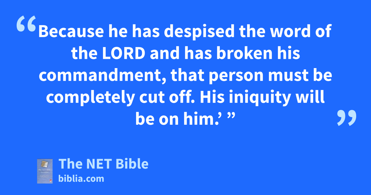 15:30 “ ‘But the person30 who acts defiantly,31 whether native-born or a resident foreigner, insults32 the Lord.33 That person34 must be cut off35 from among his people. 15:31 Because he has despised36 the word of the Lord and has broken37 his commandment, that person38 must be completely cut off.39 His iniquity will be on him.’ ”40