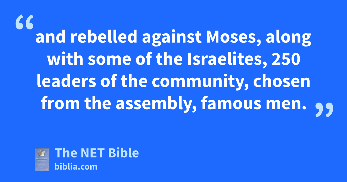 16:1 1 Now Korah son of Izhar, the son of Kohath, the son of Levi, and Dathan and Abiram, the sons of Eliab, and On son of Peleth, who were Reubenites,2 took men3 16:2 and rebelled against Moses, along with some of the Israelites, 250 leaders4 of the community, chosen from the assembly,5 famous men.6 16:3 And they assembled against Moses and Aaron, saying to them, “You take too much upon yourselves,7 seeing that the whole community is holy, every one of them, and the Lord is among them. Why then do you exalt yourselves above the community of the Lord?”