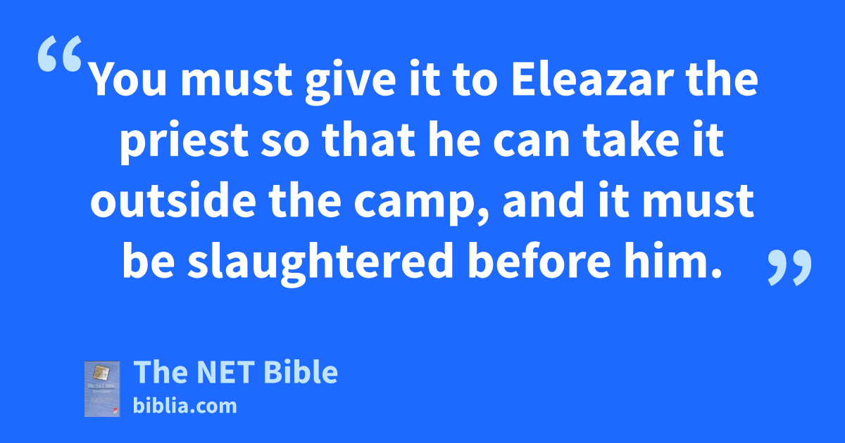 19:1 1 The Lord spoke to Moses and Aaron: 19:2 “This is the ordinance of the law which the Lord has commanded: ‘Instruct2 the Israelites to bring3 you a red4 heifer5 without blemish, which has no defect6 and has never carried a yoke. 19:3 You must give it to Eleazar the priest so that he can take it outside the camp, and it must be slaughtered before him.7 19:4 Eleazar the priest is to take8 some of its blood with his finger, and sprinkle some of the blood seven times9 directly in front of the tent of meeting. 19:5 Then the heifer must be burned10 in his sight—its skin, its flesh, its blood, and its offal is to be burned.11 19:6 And the priest must take cedar wood, hyssop,12 and scarlet wool and throw them into the midst of the fire where the heifer is burning.13 19:7 Then the priest must wash14 his clothes and bathe himself15 in water, and afterward he may come16 into the camp, but the priest will be ceremonially unclean until evening. 19:8 The one who burns it17 must wash his clothes in water and bathe himself in water. He will be ceremonially unclean until evening.