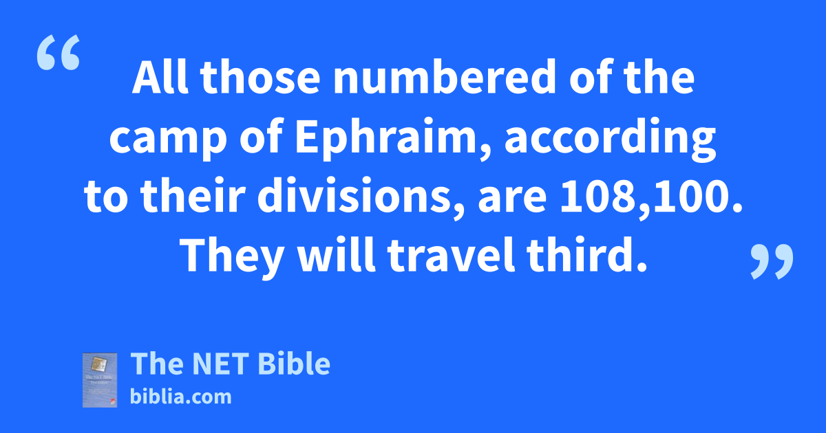 2:18 “On the west will be the divisions of the camp of Ephraim under their standard. The leader of the people of Ephraim is Elishama son of Amihud. 2:19 Those numbered in his division are 40,500. 2:20 Next to them will be the tribe of Manasseh. The leader of the people of Manasseh is Gamaliel son of Pedahzur. 2:21 Those numbered in his division are 32,200. 2:22 Next will be19 the tribe of Benjamin. The leader of the people of Benjamin is Abidan son of Gideoni. 2:23 Those numbered in his division are 35,400. 2:24 All those numbered of the camp of Ephraim, according to their divisions, are 108,100. They will travel third.