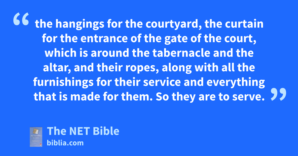 4:21 Then the Lord spoke to Moses: 4:22 “Also take a census of the Gershonites, by their clans and by their families. 4:23 You must number them from thirty years old and upward to fifty years old, all who enter the company to do the work of the tent of meeting. 4:24 This is the service of the families of Gershonites, as they serve28 and carry it. 4:25 They must carry the curtains for the tabernacle and the tent of meeting with its covering, the covering of fine leather that is over it, the curtains for the entrance of the tent of meeting, 4:26 the hangings for the courtyard, the curtain for the entrance of the gate of the court,29 which is around the tabernacle and the altar, and their ropes, along with all the furnishings for their service and everything that is made for them. So they are to serve.30