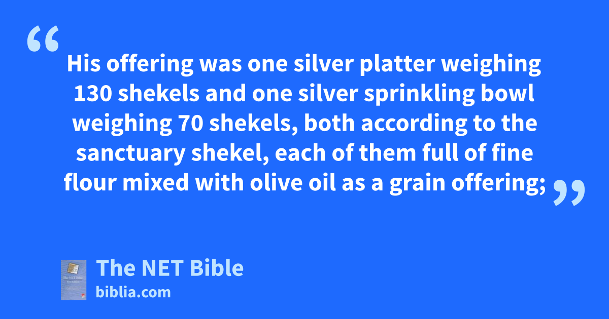 7:18 On the second day Nethanel son of Zuar, leader of Issachar, presented an offering. 7:19 He offered for his offering one silver platter weighing 130 shekels and one silver sprinkling bowl weighing 70, both according to the sanctuary shekel, each of them full of fine flour mixed with olive oil as a grain offering; 7:20 one gold pan weighing 10 shekels, full of incense; 7:21 one young bull, one ram, and one male lamb in its first year, for a burnt offering; 7:22 one male goat for a purification offering; 7:23 and for the sacrifice of peace offerings: two bulls, five rams, five male goats, and five male lambs in their first year. This was the offering of Nethanel son of Zuar.