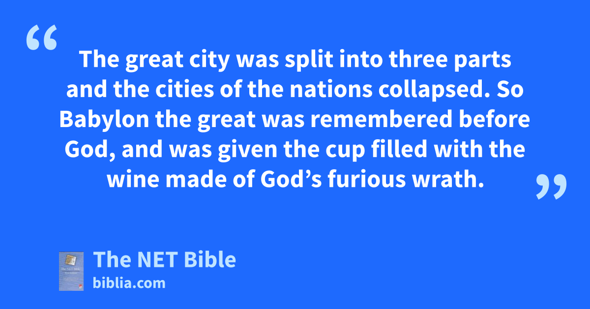 16:17 Finally55 the seventh angel56 poured out his bowl into the air and a loud voice came out of the temple from the throne, saying: “It is done!” 16:18 Then57 there were flashes of lightning, roaring,58 and crashes of thunder, and there was a tremendous earthquake—an earthquake unequaled since humanity59 has been on the earth, so tremendous was that earthquake. 16:19 The60 great city was split into three parts and the cities of the nations61 collapsed.62 So63 Babylon the great was remembered before God, and was given the cup64 filled with the wine made of God’s furious wrath.65 16:20 Every66 island fled away67 and no mountains could be found.68 16:21 And gigantic hailstones, weighing about a hundred pounds69 each, fell from heaven70 on people,71 but they72 blasphemed God because of the plague of hail, since it73 was so horrendous.74