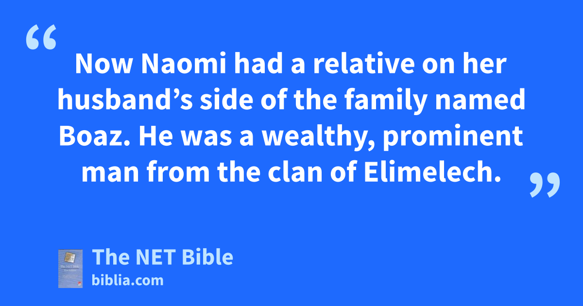 2:1 Now Naomi1 had a relative2 on her husband’s side of the family named Boaz. He was a wealthy, prominent man from the clan of Elimelech.3 2:2 One day Ruth the Moabite said to Naomi, “Let me go4 to the fields so I can gather5 grain behind whoever permits me to do so.”6 Naomi7 replied, “You may go, my daughter.” 2:3 So Ruth8 went and gathered grain in the fields9 behind the harvesters. Now she just happened to end up10 in the portion of the field belonging to Boaz, who was from the clan of Elimelech.