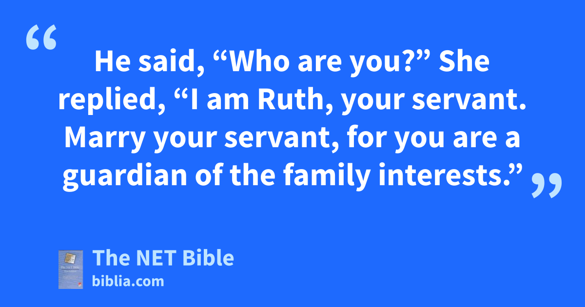 3:6 So she went down to the threshing floor and did everything her mother-in-law had instructed her to do.19 3:7 When Boaz had finished his meal and was feeling satisfied, he lay down to sleep at the far end of the grain heap.20 Then Ruth21 crept up quietly,22 uncovered his legs,23 and lay down beside him.24 3:8 In the middle of the night he was startled25 and turned over.26 Now27 he saw a woman28 lying beside him!29 3:9 He said, “Who are you?”30 She replied, “I am Ruth, your servant.31 Marry your servant,32 for you are a guardian of the family interests.”33 3:10 He said, “May you be rewarded34 by the Lord, my dear!35 This act of devotion36 is greater than what you did before.37 For you have not sought to marry38 one of the young men, whether rich or poor.39 3:11 Now, my dear, don’t worry!40 I intend to do for you everything you propose,41 for everyone in the village42 knows that you are a worthy woman.43 3:12 Now yes, it is true that44 I am a guardian,45 but there is another guardian who is a closer relative than I am. 3:13 Remain here tonight. Then in the morning, if he agrees to marry you,46 fine,47 let him do so.48 But if he does not want to do so, I promise, as surely as the Lord lives, to marry you.49 Sleep here until morning.”50 3:14 So she slept beside him51 until morning. She woke up while it was still dark.52 Boaz thought,53 “No one must know that a woman visited the threshing floor.”54 3:15 Then he said, “Hold out the shawl55 you are wearing56 and grip it tightly.” As she held it tightly, he measured out about sixty pounds57 of barley into the shawl and put it on her shoulders. Then he58 went into town, 3:16 and she returned to her mother-in-law.