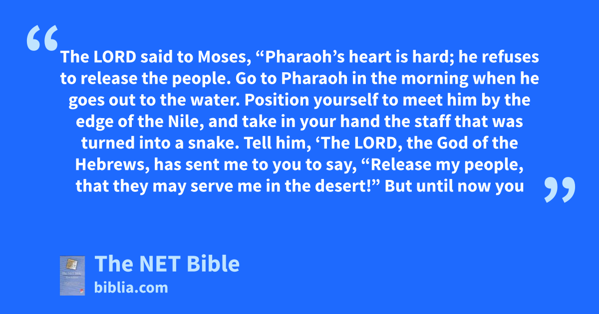 7:14 26 The Lord said to Moses, “Pharaoh’s heart is hard;27 he refuses to release28 the people. 7:15 Go to Pharaoh in the morning when29 he goes out to the water. Position yourself30 to meet him by the edge of the Nile,31 and take32 in your hand the staff33 that was turned into a snake. 7:16 Tell him, ‘The Lord, the God of the Hebrews, has sent me to you to say,34 “Release my people, that they may serve me35 in the desert!” But until now36 you have not listened.37 7:17 Thus says the Lord: “By this you will know that I am the Lord: I am going to strike38 the water of the Nile with the staff that is in my hand, and it will be turned into blood.39 7:18 Fish40 in the Nile will die, the Nile will stink, and the Egyptians will be unable41 to drink water from the Nile.” ’ ” 7:19 Then the Lord said to Moses, “Tell Aaron, ‘Take your staff and stretch out your hand over Egypt’s waters—over their rivers, over their canals,42 over their ponds, and over all their reservoirs43—so that it becomes44 blood.’ There will be blood everywhere in45 the land of Egypt, even in wooden and stone containers.” 7:20 Moses and Aaron did so,46 just as the Lord had commanded. Moses raised47 the staff48 and struck the water that was in the Nile right before the eyes49 of Pharaoh and his servants,50 and all the water that was in the Nile was turned to blood.51 7:21 When the fish52 that were in the Nile died, the Nile began53 to stink, so that the Egyptians could not drink water from the Nile. There was blood54 everywhere in the land of Egypt! 7:22 But the magicians of Egypt did the same55 by their secret arts, and so56 Pharaoh’s heart remained hard,57 and he refused to listen to Moses and Aaron58—just as the Lord had predicted. 7:23 And Pharaoh turned and went into his house. He did not pay any attention to this.59 7:24 All the Egyptians dug around the Nile for water to drink,60 because they could not drink the water of the Nile.