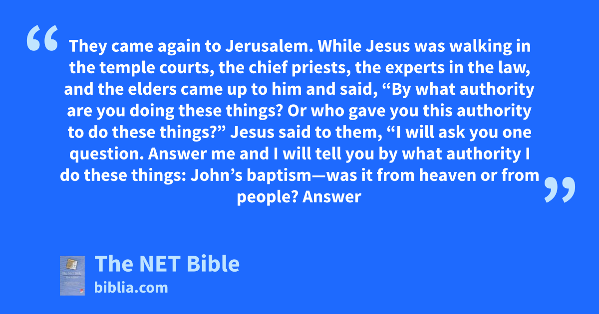 11:27 They came again to Jerusalem.39 While Jesus40 was walking in the temple courts,41 the chief priests, the experts in the law,42 and the elders came up to him 11:28 and said, “By what authority43 are you doing these things? Or who gave you this authority to do these things?” 11:29 Jesus said to them, “I will ask you one question. Answer me and I will tell you by what authority I do these things: 11:30 John’s baptism—was it from heaven or from people?44 Answer me.” 11:31 They discussed with one another, saying, “If we say, ‘From heaven,’ he will say, ‘Then why did you not believe him?’ 11:32 But if we say, ‘From people—’ ” (they feared the crowd, for they all considered John to be truly a prophet). 11:33 So45 they answered Jesus,46 “We don’t know.”47 Then Jesus said to them, “Neither will I tell you48 by what authority49 I am doing these things.”