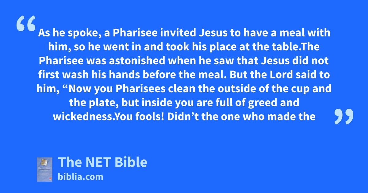 11:37 As he spoke,114 a Pharisee115 invited Jesus116 to have a meal with him, so he went in and took his place at the table.117 11:38 The118 Pharisee was astonished when he saw that Jesus119 did not first wash his hands120 before the meal. 11:39 But the Lord said to him, “Now you Pharisees clean121 the outside of the cup and the plate, but inside you are full of greed and wickedness.122 11:40 You fools!123 Didn’t the one who made the outside make the inside as well?124 11:41 But give from your heart to those in need,125 and126 then everything will be clean for you.127