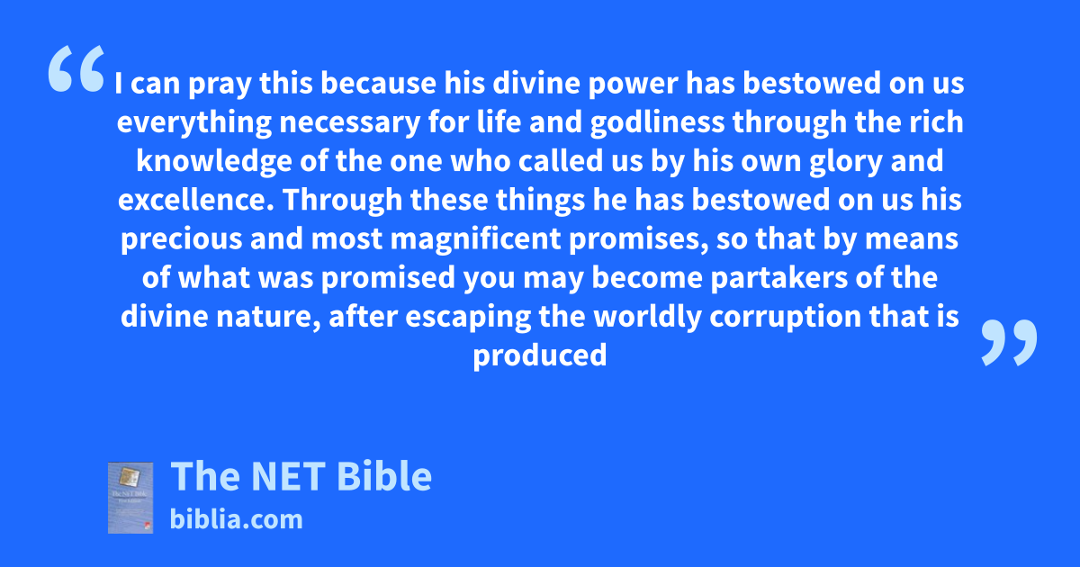 1:3 I can pray this because his divine power12 has bestowed on us everything necessary13 for life and godliness through the rich knowledge14 of the one who called15 us by16 his own glory and excellence. 1:4 Through these things17 he has bestowed on us his precious and most magnificent promises, so that by means of what was promised18 you may become partakers of the divine nature,19 after escaping20 the worldly corruption that is produced by evil desire.21 1:5 For this very reason,22 make every effort23 to add to your faith excellence,24 to excellence, knowledge; 1:6 to knowledge, self-control; to self-control, perseverance;25 to perseverance, godliness; 1:7 to godliness, brotherly affection; to brotherly affection, unselfish26 love.27 1:8 For if28 these things are really yours29 and are continually increasing,30 they will keep you from becoming31 ineffective and unproductive in your pursuit of32 knowing our Lord Jesus Christ more intimately.33 1:9 But34 concerning the one who lacks such things35—he is blind. That is to say, he is36 nearsighted, since he has forgotten about the cleansing of his past sins. 1:10 Therefore, brothers and sisters,37 make every effort to be sure of your calling and election.38 For by doing this39 you will never40 stumble into sin.41 1:11 For thus an entrance into the eternal kingdom of our Lord and Savior, Jesus Christ, will be richly provided for you.