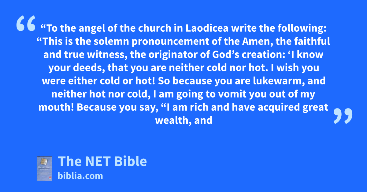 “This is the solemn pronouncement of53 the Amen, the faithful and true witness, the originator54 of God’s creation: 3:15 ‘I know your deeds, that you are neither cold nor hot.55 I wish you were either cold or hot! 3:16 So because you are lukewarm, and neither hot nor cold, I am going56 to vomit57 you out of my mouth! 3:17 Because you say, “I am rich and have acquired great wealth,58 and need nothing,” but59 do not realize that you are wretched, pitiful,60 poor, blind, and naked, 3:18 take my advice61 and buy gold from me refined by fire so you can become rich! Buy from me62 white clothing so you can be clothed and your shameful nakedness63 will not be exposed, and buy eye salve64 to put on your eyes so you can see! 3:19 All those65 I love, I rebuke and discipline. So be earnest and repent! 3:20 Listen!66 I am standing at the door and knocking! If anyone hears my voice and opens the door I will come into his home67 and share a meal with him, and he with me. 3:21 I will grant the one68 who conquers69 permission70 to sit with me on my throne, just as I too conquered71 and sat down with my Father on his throne. 3:22 The one who has an ear had better hear what the Spirit says to the churches.’ ”