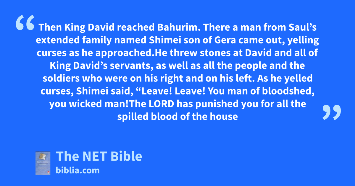 16:5 Then King David reached8 Bahurim. There a man from Saul’s extended family named Shimei son of Gera came out, yelling curses as he approached.9 16:6 He threw stones at David and all of King David’s servants, as well as all the people and the soldiers who were on his right and on his left. 16:7 As he yelled curses, Shimei said, “Leave! Leave! You man of bloodshed, you wicked man!10 16:8 The Lord has punished you for11 all the spilled blood of the house of Saul, in whose place you rule. Now the Lord has given the kingdom into the hand of your son Absalom. Disaster has overtaken you, for you are a man of bloodshed!”