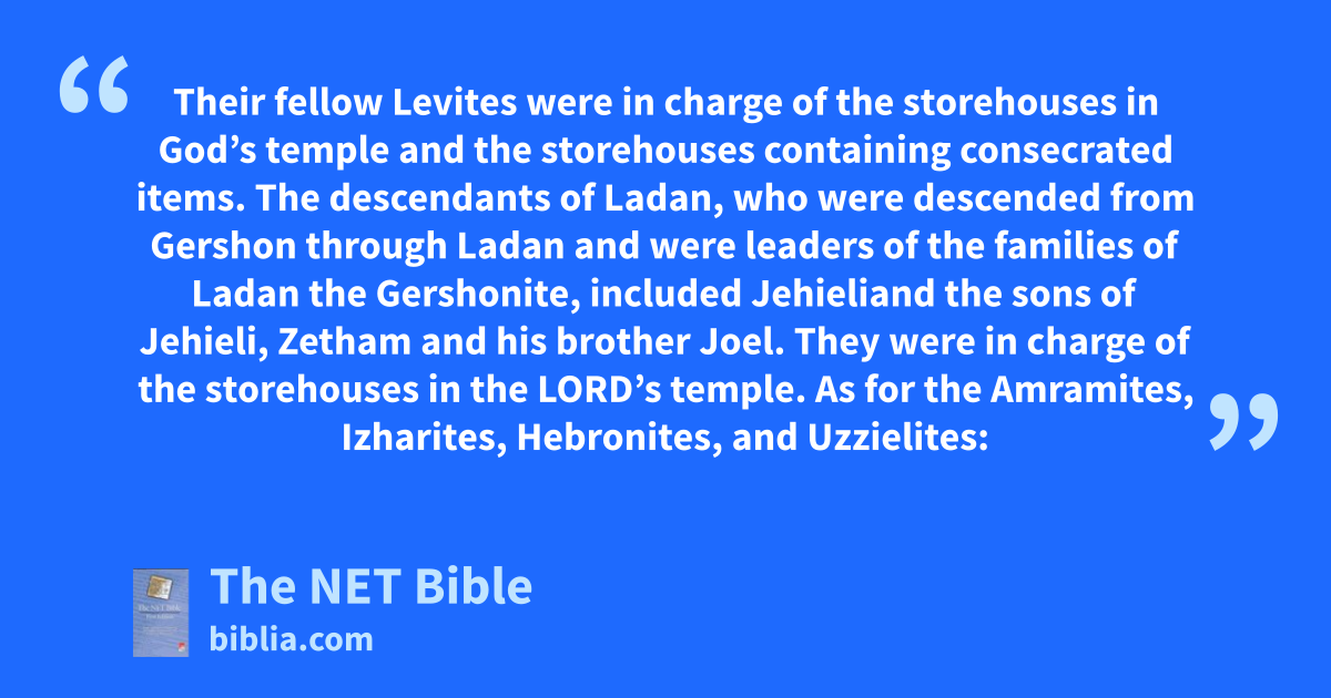 26:20 Their fellow Levites were in charge of the storehouses5 in God’s temple and the storehouses containing consecrated items. 26:21 The descendants of Ladan,6 who were descended from Gershon through Ladan and were leaders of the families of Ladan the Gershonite, included Jehieli7 26:22 and the sons of Jehieli, Zetham and his brother Joel. They were in charge of the storehouses in the Lord’s temple.