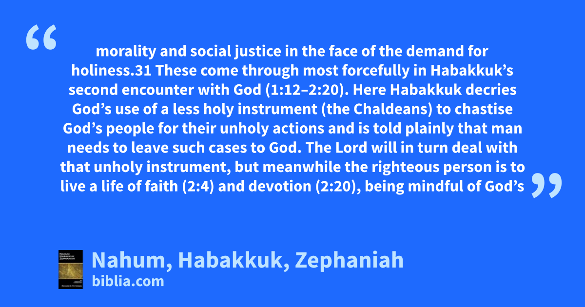 morality and social justice in the face of the demand for holiness.31 These come through most forcefully in Habakkuk’s second encounter with God (1:12–2:20). Here Habakkuk decries God’s use of a less holy instrument (the Chaldeans) to chastise God’s people for their unholy actions and is told plainly that man needs to leave such cases to God. The Lord will in turn deal with that unholy instrument, but meanwhile the righteous person is to live a life of faith (2:4) and devotion (2:20), being mindful of God’s