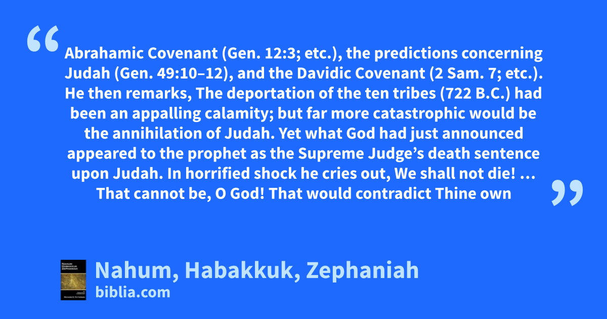 Abrahamic Covenant (Gen. 12:3; etc.), the predictions concerning Judah (Gen. 49:10–12), and the Davidic Covenant (2 Sam. 7; etc.). He then remarks, The deportation of the ten tribes (722 B.C.) had been an appalling calamity; but far more catastrophic would be the annihilation of Judah. Yet what God had just announced appeared to the prophet as the Supreme Judge’s death sentence upon Judah. In horrified shock he cries out, We shall not die! … That cannot be, O God! That would contradict Thine own