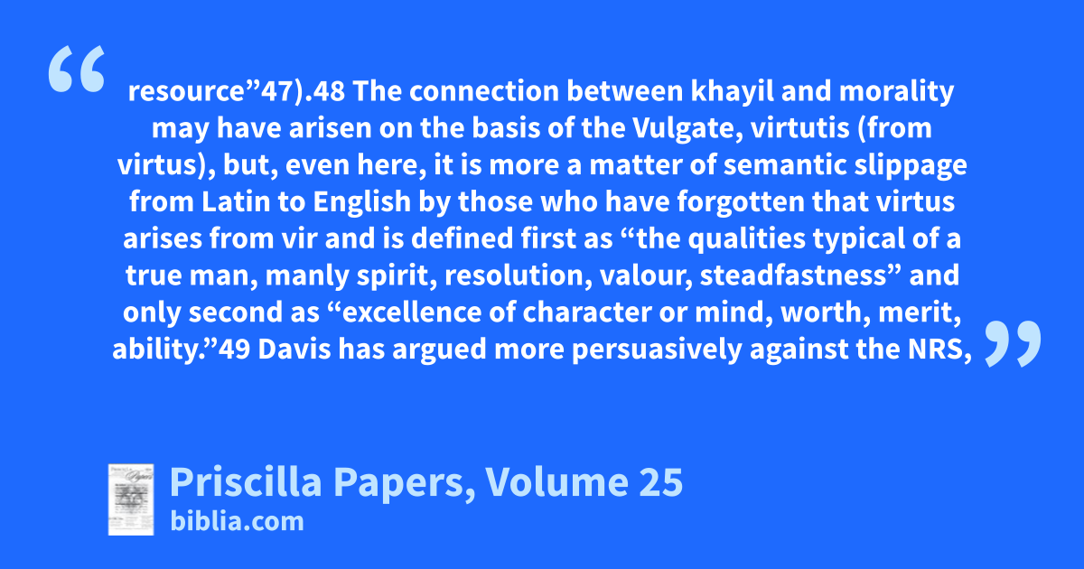 resource”47).48 The connection between khayil and morality may have arisen on the basis of the Vulgate, virtutis (from virtus), but, even here, it is more a matter of semantic slippage from Latin to English by those who have forgotten that virtus arises from vir and is defined first as “the qualities typical of a true man, manly spirit, resolution, valour, steadfastness” and only second as “excellence of character or mind, worth, merit, ability.”49 Davis has argued more persuasively against the NRS,