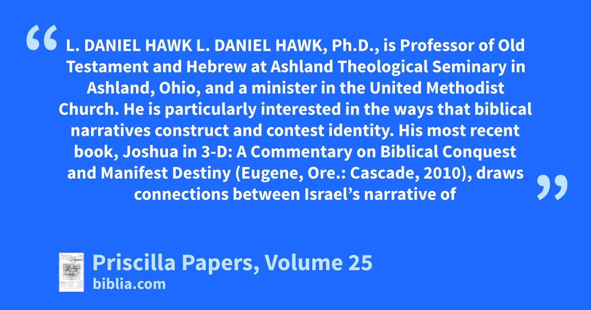 L. DANIEL HAWK L. DANIEL HAWK, Ph.D., is Professor of Old Testament and Hebrew at Ashland Theological Seminary in Ashland, Ohio, and a minister in the United Methodist Church. He is particularly interested in the ways that biblical narratives construct and contest identity. His most recent book, Joshua in 3-D: A Commentary on Biblical Conquest and Manifest Destiny (Eugene, Ore.: Cascade, 2010), draws connections between Israel’s narrative of