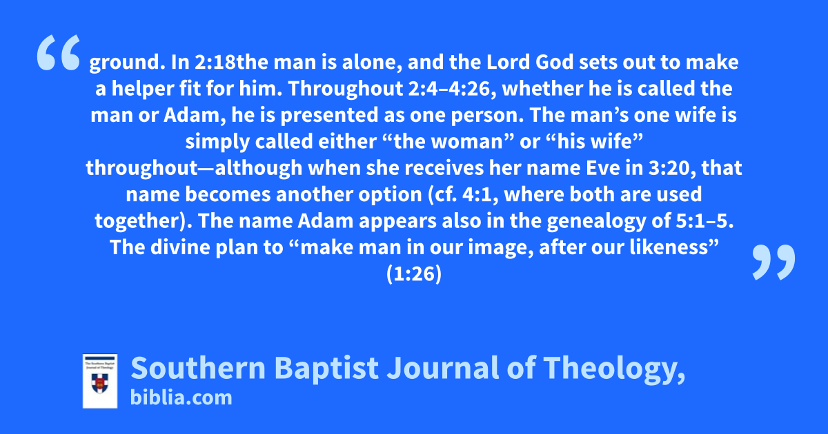 ground. In 2:18the man is alone, and the Lord God sets out to make a helper fit for him. Throughout 2:4–4:26, whether he is called the man or Adam, he is presented as one person. The man’s one wife is simply called either “the woman” or “his wife” throughout—although when she receives her name Eve in 3:20, that name becomes another option (cf. 4:1, where both are used together). The name Adam appears also in the genealogy of 5:1–5. The divine plan to “make man in our image, after our likeness” (1:26)