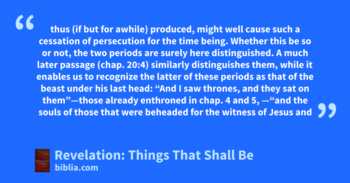 thus (if but for awhile) produced, might well cause such a cessation of persecution for the time being. Whether this be so or not, the two periods are surely here distinguished. A much later passage (chap. 20:4) similarly distinguishes them, while it enables us to recognize the latter of these periods as that of the beast under his last head: “And I saw thrones, and they sat on them”—those already enthroned in chap. 4 and 5, —“and the souls of those that were beheaded for the witness of Jesus and