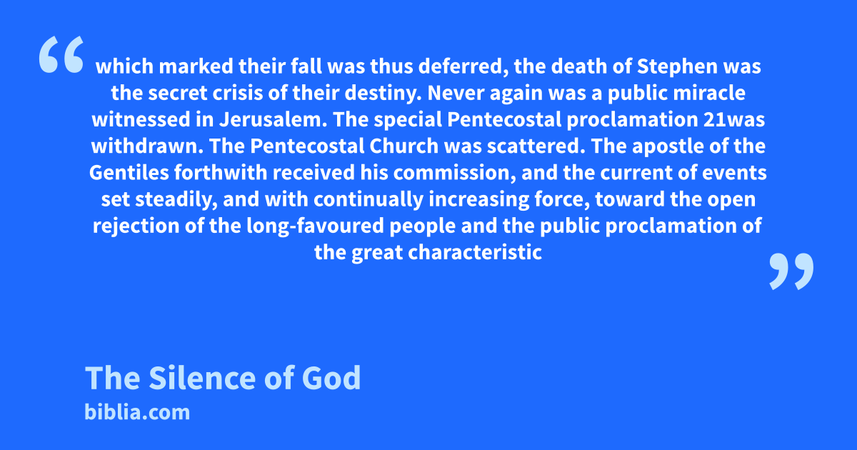 which marked their fall was thus deferred, the death of Stephen was the secret crisis of their destiny. Never again was a public miracle witnessed in Jerusalem. The special Pentecostal proclamation 21was withdrawn. The Pentecostal Church was scattered. The apostle of the Gentiles forthwith received his commission, and the current of events set steadily, and with continually increasing force, toward the open rejection of the long-favoured people and the public proclamation of the great characteristic